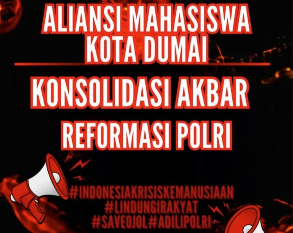 POSRIAU.COM – Aliansi Mahasiswa Kota Dumai akan menggelar konsolidasi akbar bertajuk Reformasi Polri di Taman Bukit Gelanggang pada Jumat (29/8/2025). Acara ini dijadwalkan dimulai pukul 15.00 WIB hingga selesai dengan melibatkan berbagai elemen dan lintas kampus.