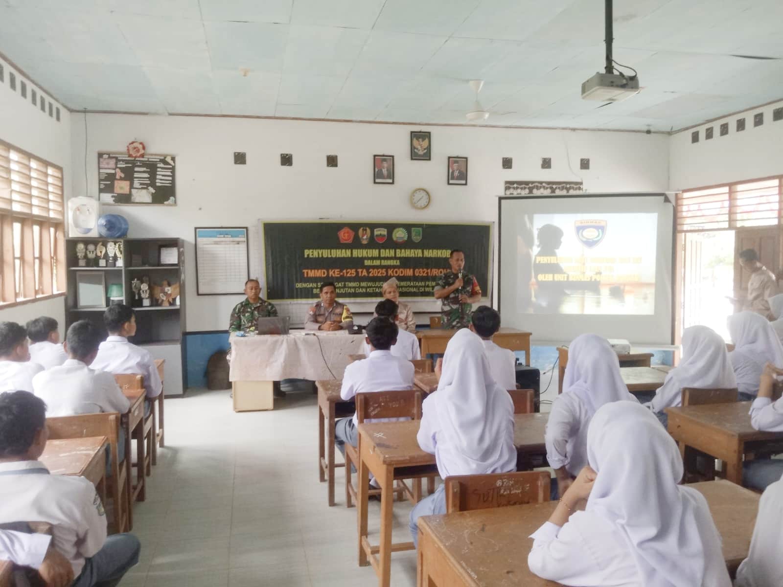 Rohil (sekilas Riau) – Sebagai bagian dari program TNI Manunggal Membangun Desa (TMMD) ke-125 Kodim 0321/Rokan Hilir, kegiatan penyuluhan hukum dan bahaya narkoba digelar pada Senin, 4 Agustus 2025, pukul 09.00 WIB di ruang kelas SMA Negeri 1 Kecamatan Pekaitan, Kabupaten Rokan Hilir. Kegiatan ini dihadiri oleh Wakil Kepala Sekolah, M. Rauf, S.Pd., beserta para siswa dan guru.