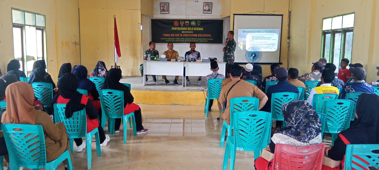 Rohil (sekilas Riau) – Dalam rangkaian program TNI Manunggal Membangun Desa (TMMD) ke-125 Kodim 0321/Rokan Hilir, kegiatan penyuluhan bela negara digelar pada Senin, 4 Agustus 2025, pukul 10.30 WIB di Aula Kepenghuluan Karya Mulyo Sari, Kecamatan Pekaitan, Kabupaten Rokan Hilir.