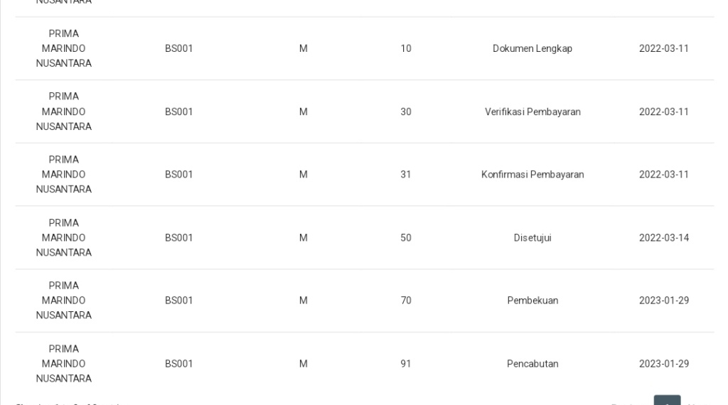 Kemudian saat dilakukan penelusuran detail status permohonan Lembaga SBU di website LPJK PUPR ditemukan bahwa PT Prima Marindo Nusantara dengan subklasifikasi Bangunan Sipil Jembatan, Jalan Layang, Flyover dan Underpass dengan kode BS002 berstatus Pencabutan.
