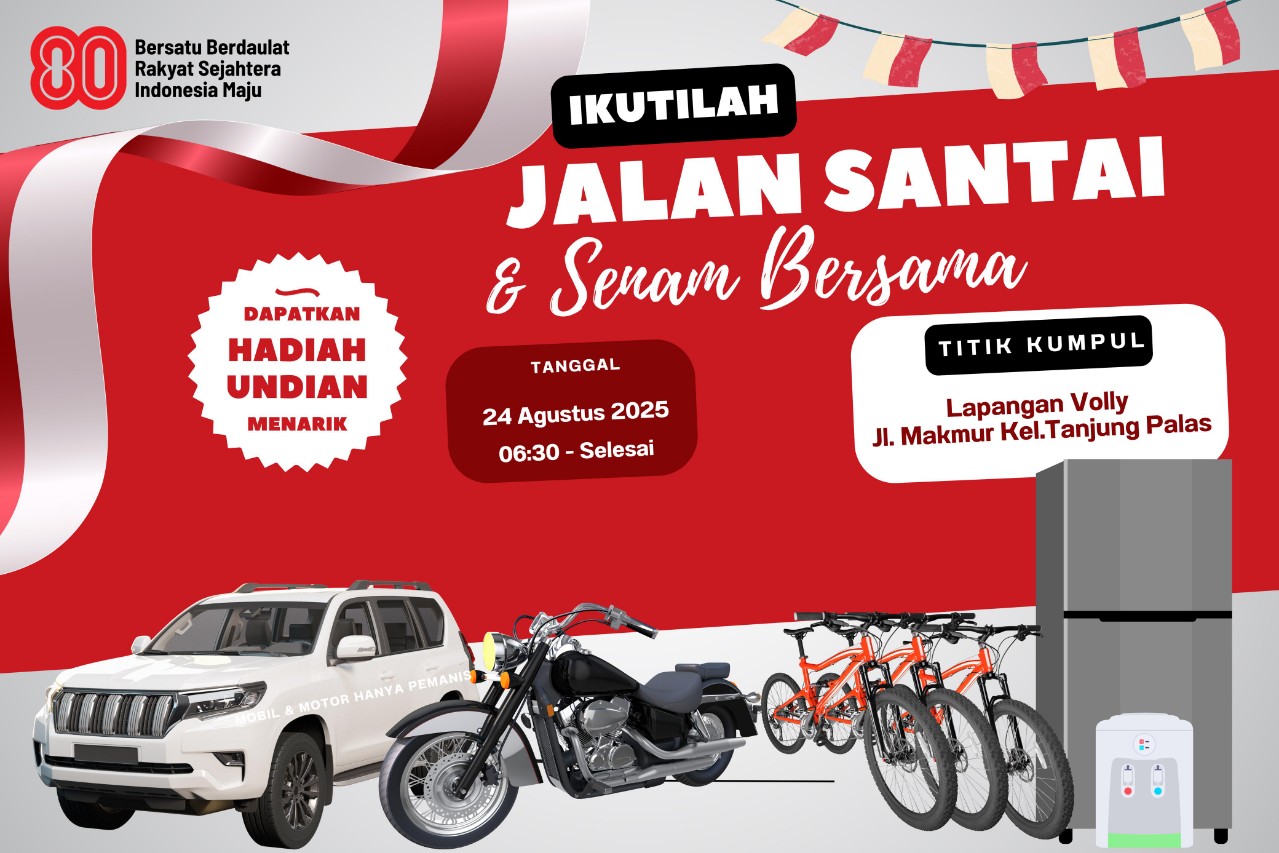 Kegiatan yang digelar oleh gabungan perangkat Kelurahan Tanjung Palas ini akan berlangsung Minggu, 24 Agustus 2025, dengan titik kumpul di Lapangan Volly Jalan Makmur, Kelurahan Tanjung Palas, kota Dumai.
