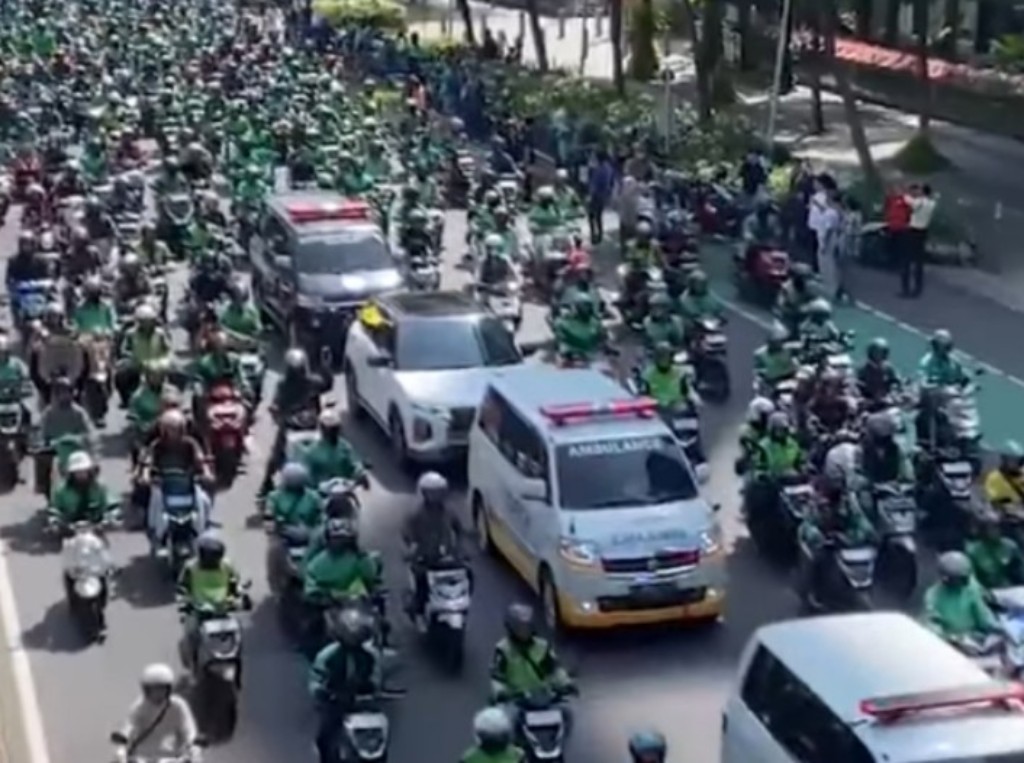 Dalam video yang beredar, tampak Ribuan Ojol yang rata-rata menggunakan baju berwarna hijau di samping mobil jenazah.