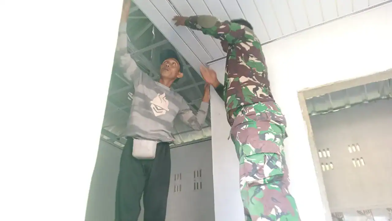 Pengerjaan plafon MCK ini dilakukan melalui kerja sama yang erat antara Satgas TMMD dan warga setempat. Salah satu warga, Lesmono (42 tahun), turut bekerja bersama Kopda Ibnu dari Tim Satgas TMMD dalam memasang plafon.